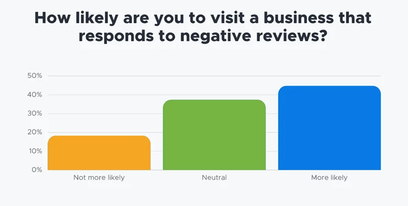 Negative feedback happens. But 45% of consumers say they are more likely to go to a business if it responds to negative reviews. Let’s see how you can handle it: