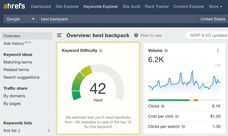 - Use SEO tools like Semrush or Ahrefs to discover relevant keywords with good search volume. Ideally, keep the keyword difficulty (KD) as low as possible, but if that’s not the case, aim for KD 31-60, this range strikes a good balance.