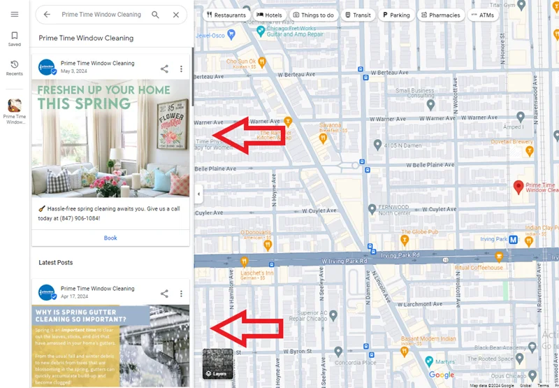 This window-washing company is a perfect example of how well you can fill out your online profiles. They put effort into their GMB and Yelp. They are also using Google Posts to show their current offers directly on their Google Search and Maps listing. This keeps their profile fresh and engaging, driving more leads and conversions.