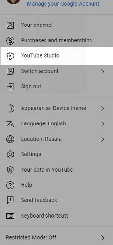 Click on the channel icon on the upper right and select “YouTube Studio” to get to settings; now select Settings on the left.