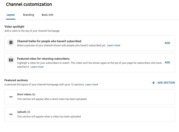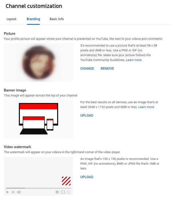 Here you determine the channel visual style. Adding a profile photo and channel logotype is easy, and you can use the same image in both cases. YouTube will tell you what files are acceptable. They must be square, with a 1:1 aspect ratio, but the profile photo is actually a circle, so do not put anything important in the corners.