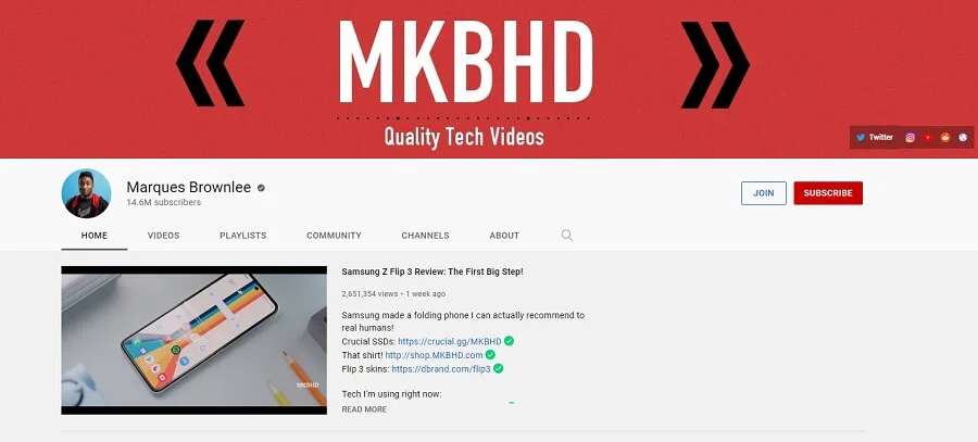 The main page should contain the channel’s trailer video. It will be located at the top of the channel page.