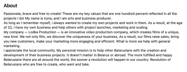 Do your best in storytelling when writing your short bio, as this is your chance to share a story, to tell people about your current prospects and plans, your priorities and achievements, or to remember how your business started and what makes you proud. But at the same time, do not go too deep into details — a list of 3-5 numbered paragraphs would be more than enough even for those skimming over the text.