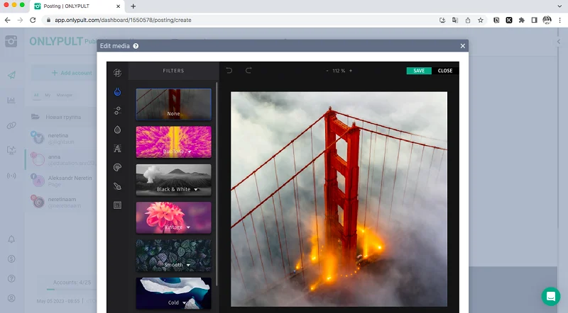 Grid planner. You can change the order and placement of the posts, choose the best visual solution, and automatically set the pre-planned time of posting. With the photo editing option, you can resize the photo, select filters, and add text or frame.