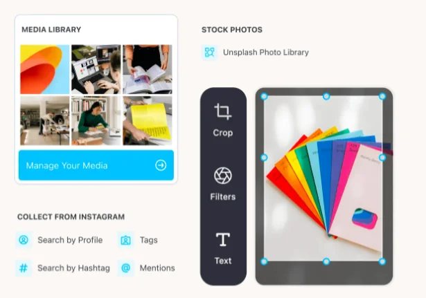 There is also an editor that can edit the pre-set sizing of the photo to adjust it to various social media standards — it can also put filters and frames and modify colors — all these features will help you make the content without switching apps and tabs.