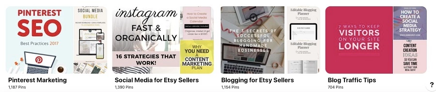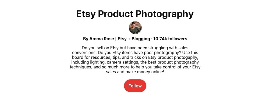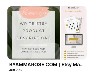Amma Rose tells her audience how to sell things on Pinterest, so her boards are divided into special categories: tips for people who have accounts on Etsy, running an Instagram account for those who sell things on Etsy, etc.