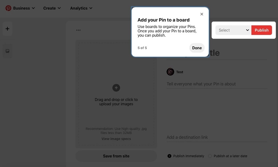 For your convenience, you can set the time for publishing a pin in advance. This option is available on the platform.