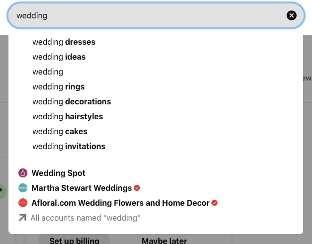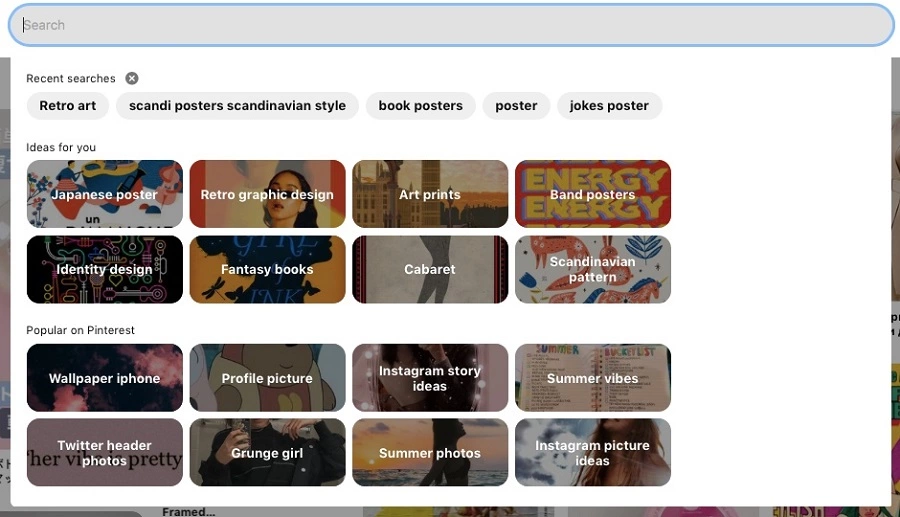 People search for recipes, home design ideas, and trendy fashion things every day. When you go to the search section, you can see categories that are popular on Pinterest now.