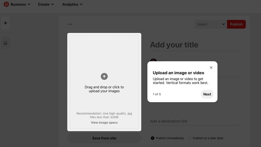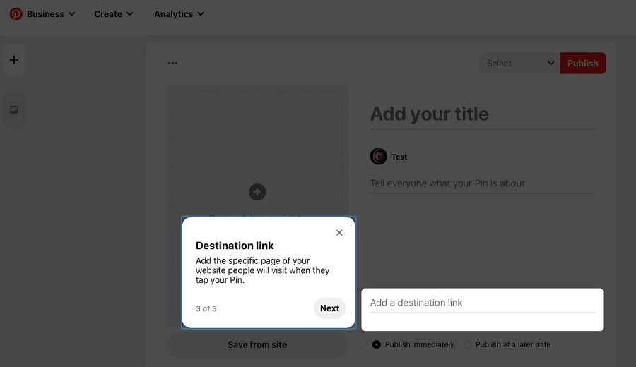 Add a relevant link to the website or a page that users should visit when they click on your pin. You can add a UTM tag to monitor traffic from Pinterest.