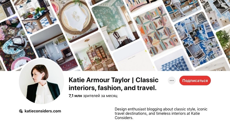 Katie Armour’s blog is focused on classical interiors, fashion, and travels. On Pinterest, she creates a collection of pictures related to these topics to attract customers’ attention to her shop.
