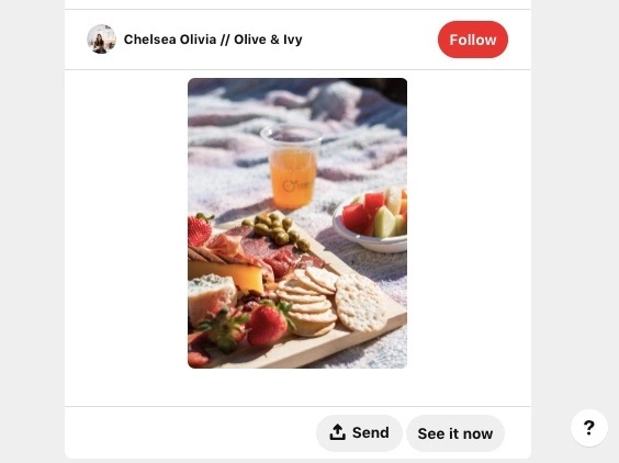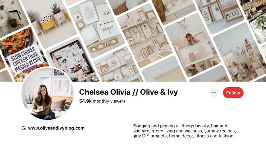 Chelsea Olivia is a lifestyle blogger. She uses Pinterest to attract more traffic to her blog. She makes posts containing links to new posts and shares her photos.