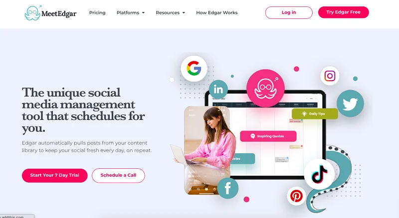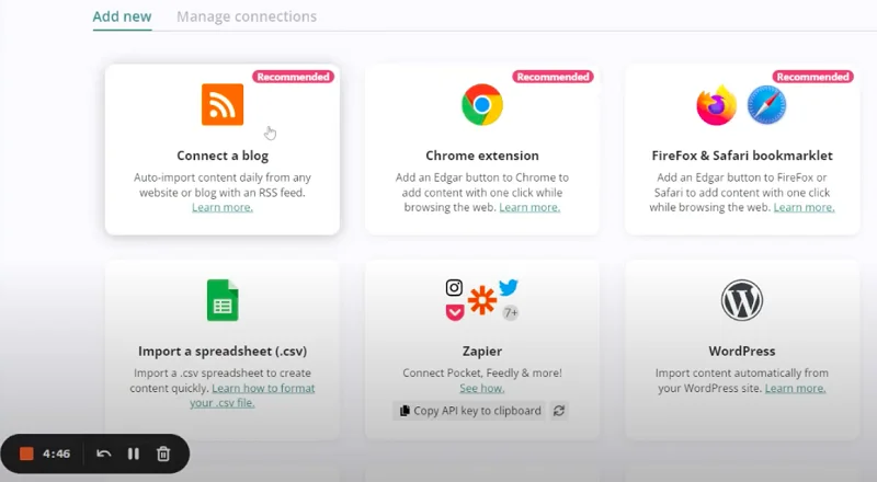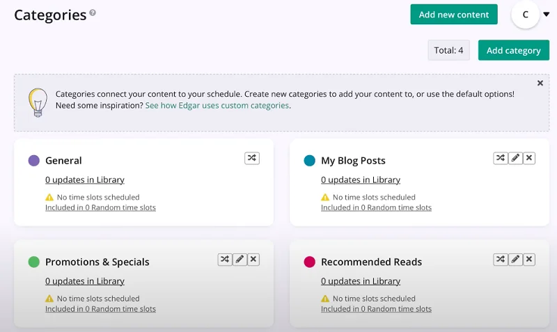 - Content library. Every time Edgar runs out of content to publish, it can repurpose the old content — not to worry about staying without ideas.