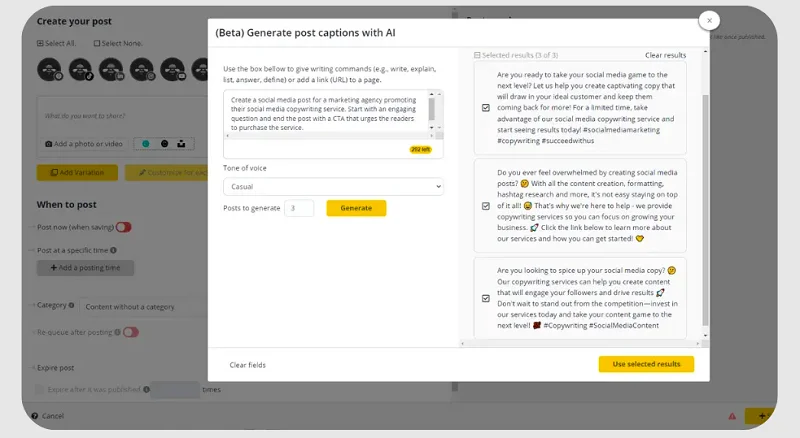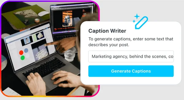 - Caption Writer tool. The Captions generator reduces the time spent working on text content. You provide the post topic — write a hint — and click the Generate Captions button.