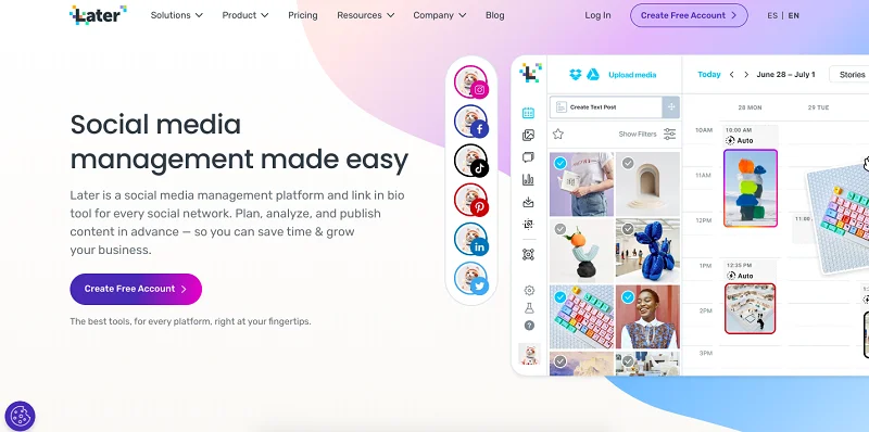 Later can post on Instagram, Twitter, TikTok, Facebook, LinkedIn, and Pinterest — the focus is on Instagram, though. The Later toolkit focuses mainly on the visual component.