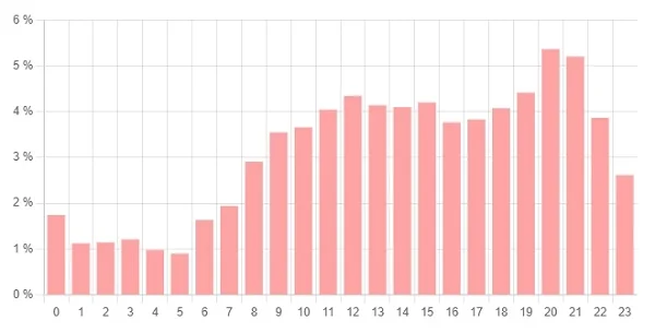 Optimal posting time looks different on Tuesday – the engagement rate stays pretty consistent from 8 a.m. to 8 p.m. Statistics also show that users tend to be particularly active during lunch (the reason does not need explanation) and around 7 p.m. when most people get off work.