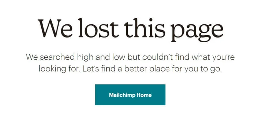 Here is an example of a humorous tone: an “Error 404. Page not found” from MailChimp: