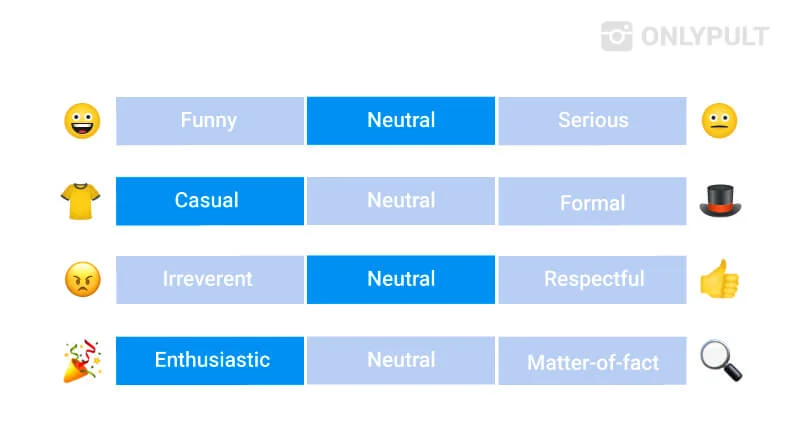 Let us begin with an important point: a tone should not be chosen only by personal preference. You might like the way a company communicates and want to imitate their style, but this would only increase the recognition of another brand and make you look like a copycat. Such a decision should be worked out in a step-by-step manner. And it takes more than knowing the audience you seek to address. You must also have deep knowledge and understanding of your brand core.