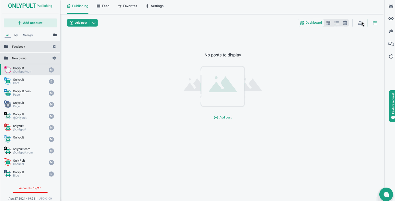 After preparing the file for uploading, first select an account where you want to import posts (the current account is highlighted in light grey on the general list), and then click on the Import icon in the top right corner.