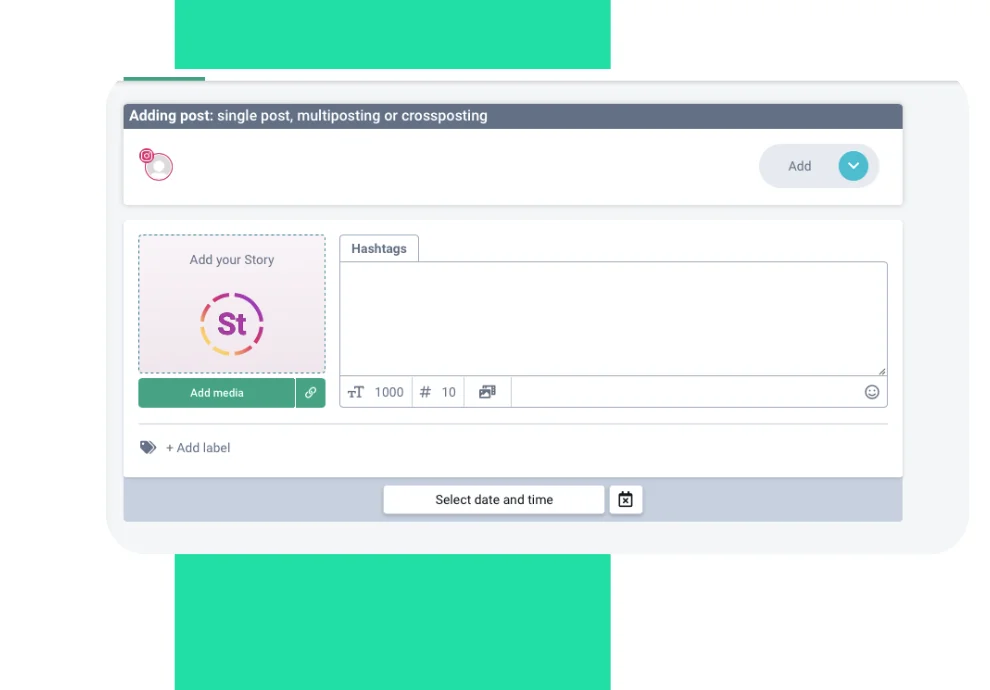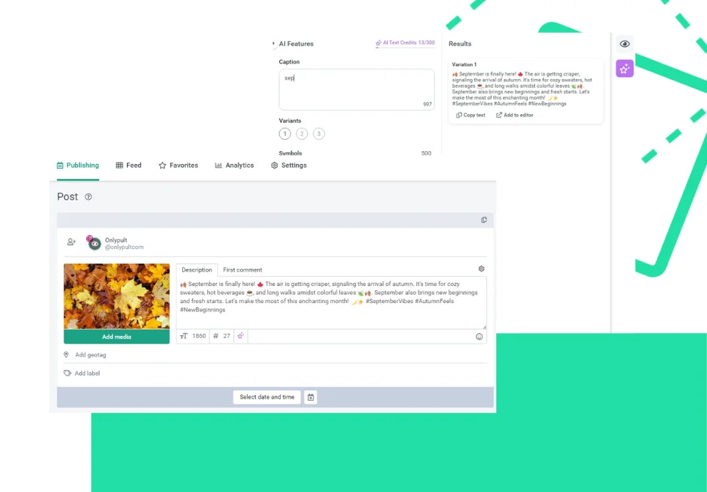 We have been preparing for a long time, and the moment has come: the new posting form is here! It is not just a design update — we have added many new features. Using artificial intelligence, you can generate up to 3 text options. If you wish, you can add hashtags or emojis and specify the writing tone: from formal to inspiring or motivational; copy the text and add it to the post field for further editing or posting.