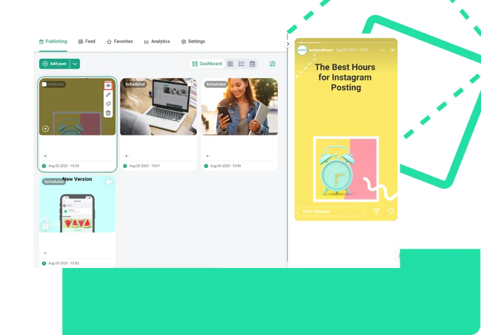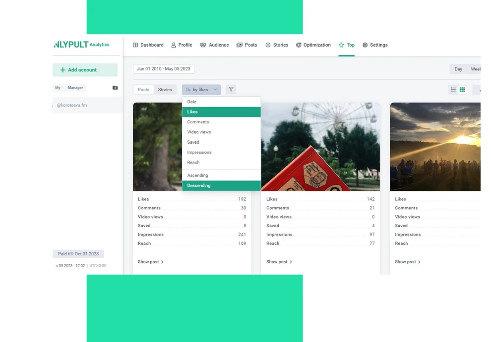 Statistics analysis on a daily, weekly, and monthly basis allows you to upgrade your content, evaluate the advertising effect, and attract more customers and followers. Instagram gives some standard set of tools for analytics, but it is quite tricky. Try using Onlypult Dashboard and feel the difference!