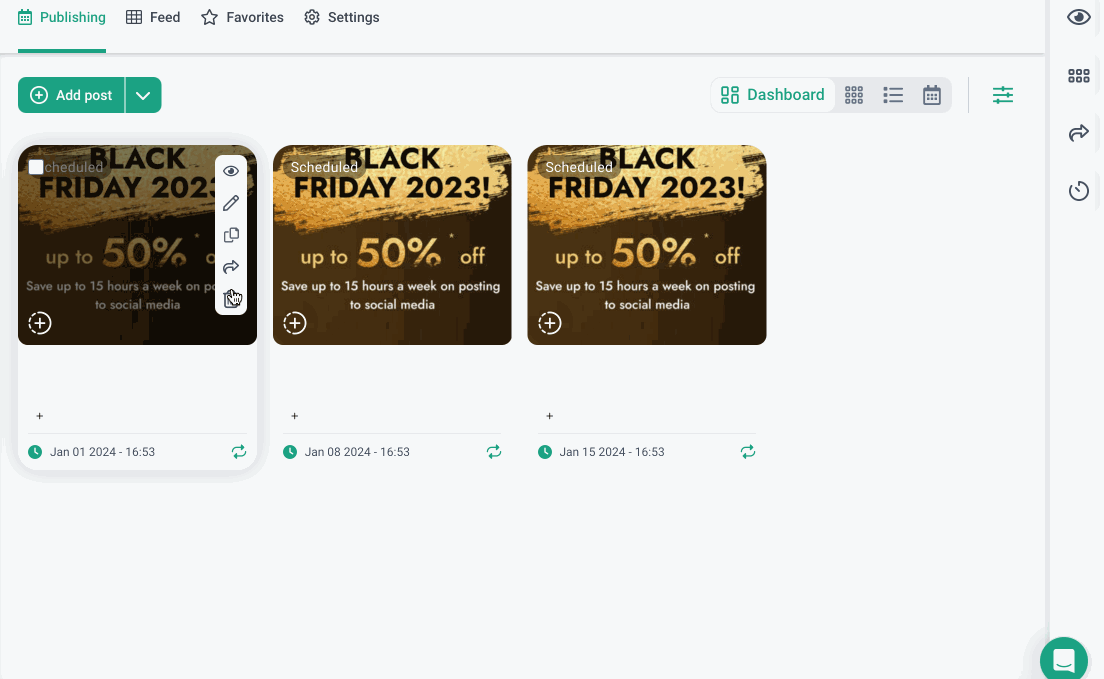 - If you are editing an original post with multiple iterations scheduled, the changes will not affect past posts that have already been released — only future posts will change.