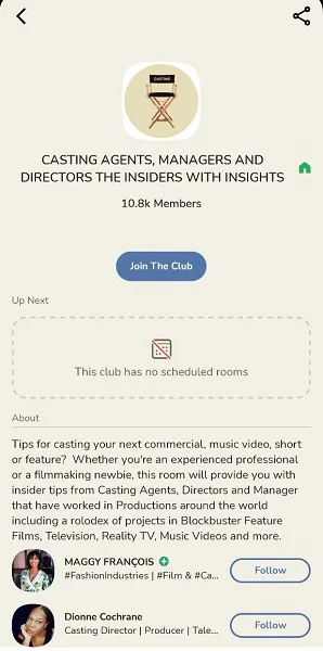 Each room is a real-time interactive podcast. The user goes from one company to another like a house party until he/she finds one that grabs attention. There are two essences inside - clubs and rooms.