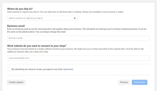 The last step is to provide the data necessary to complete the registration. They are country, e-mail address, and official website (it is also required to create the Facebook Marketplace).