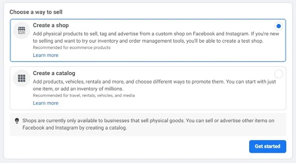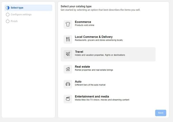 To get the most out of Facebook Shops, group products into ‘catalogs’. First, select the catalog types from the options available.