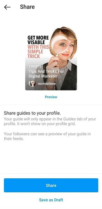 - On the next screen, you can enable the guide preview, save it to drafts, or share it immediately.