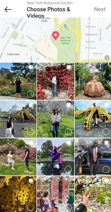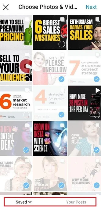 - Next, you will see your posts and saved posts. Select the posts by switching between the sections if needed. Once the selection is completed, tap the “Next” button.