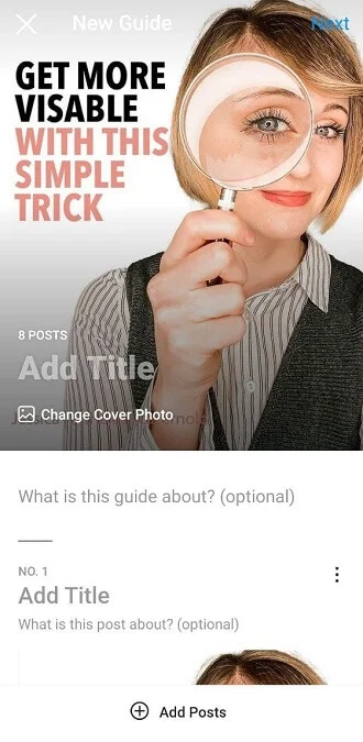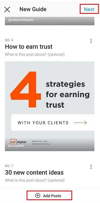- After filling in the headings and descriptions, tap “Next” if you’re done and happy with the guide. In case you want to add another post, click the “Add posts” button.