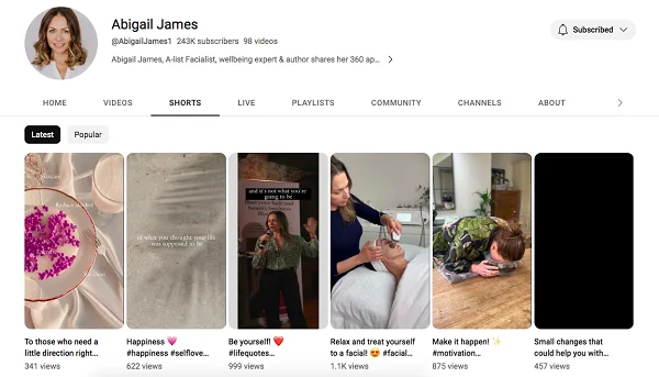 Abigail James’s YouTube channel content mainly includes training, beauty routine, tips, Q&A format, recommendations, and live broadcasts on various topics.