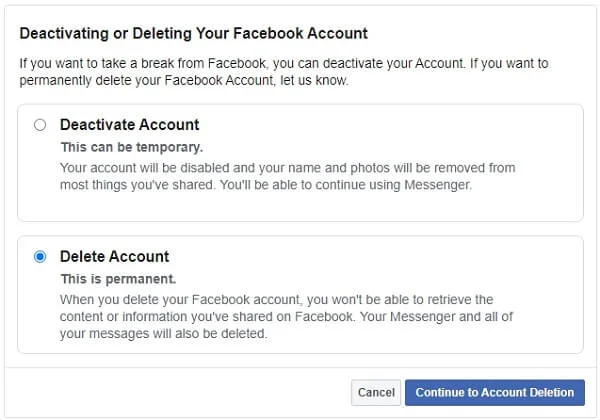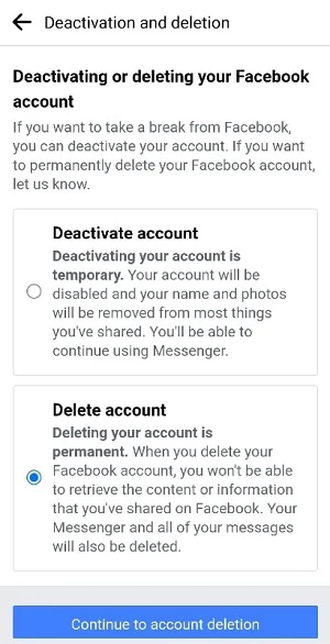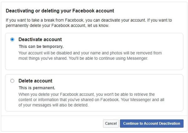 - Now you can choose between the Deactivate Account (temporarily) and Delete Account options;