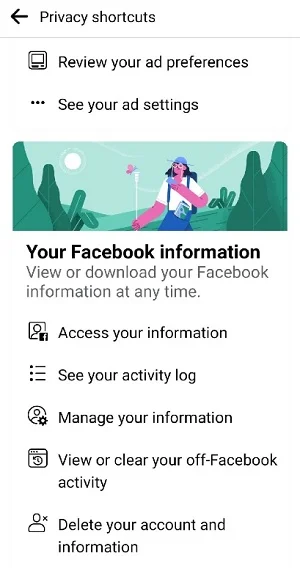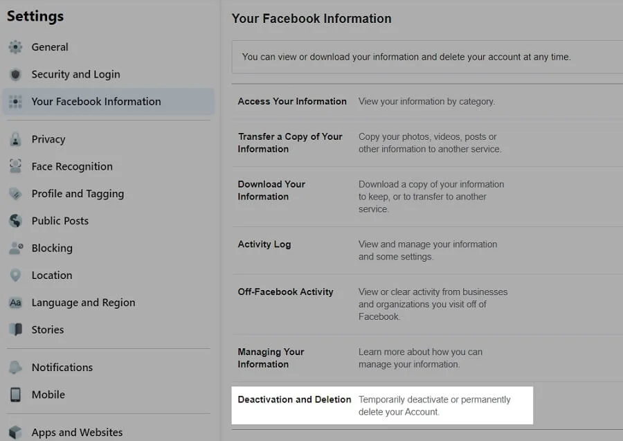 - Go to Your Facebook Information again, click on Deactivation and Deletion.