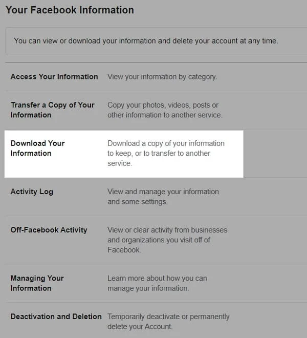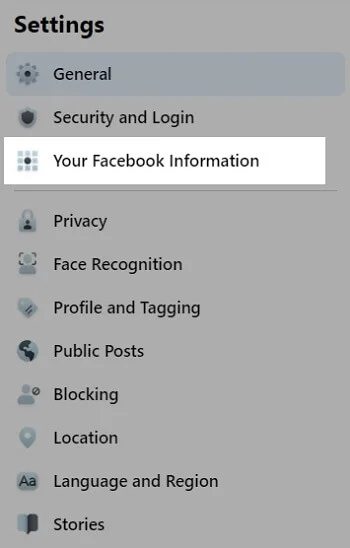 On the left, a new menu will appear, where you should click on Your Facebook Information;