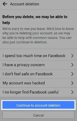 | Like other social networks, Facebook does not want to lose users — so you may get redirected to the main page at this point. If this happens, enter the deletion menu again. |