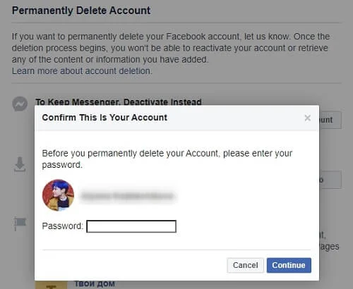 Deactivation blocks page views by others, but the Facebook messenger will still be available to you. If this is what you prefer, click on the button, enter the password and give a reason for deactivation, and press Deactivate in the bottom-left corner. Facebook will resist and send you another warning. Close the pop-up and press the deactivation button again. You did it: the profile will no longer be available;