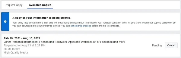 - In the Your Facebook Information section, you can export your profile media content to outside services by pressing Transfer a Copy of Your Photos and Videos.