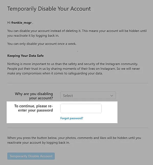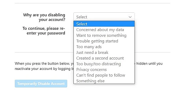 - Instagram will ask you to choose the reason for freezing your account. You can choose the reason that suits you from the list;