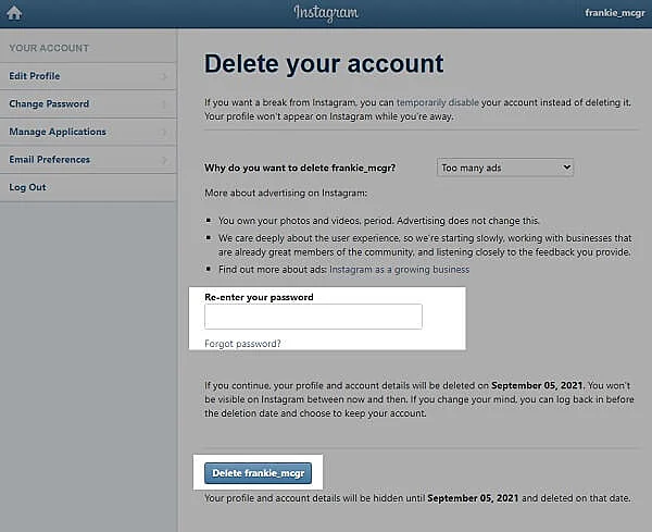 On the surface, deleting your Instagram account is not so easy. The social network does not want to lose users, so there is an account freeze function as an alternative to permanently deleting the page. That means that you can block your page for a while, and then, when you decide to return on Instagram, you can effortlessly restore your account. “Unfreeze” it with the same nickname and all the information saved: photos, videos, and the number of likes. However, of course, you can also completely delete your account. In this case, you will no longer have an option to use your account name — you won’t be able to retrieve the content.