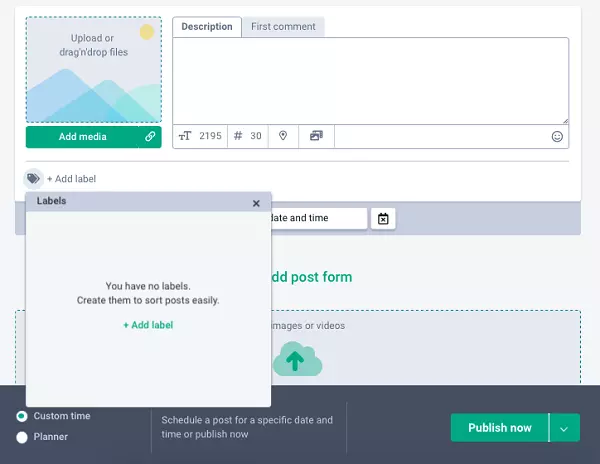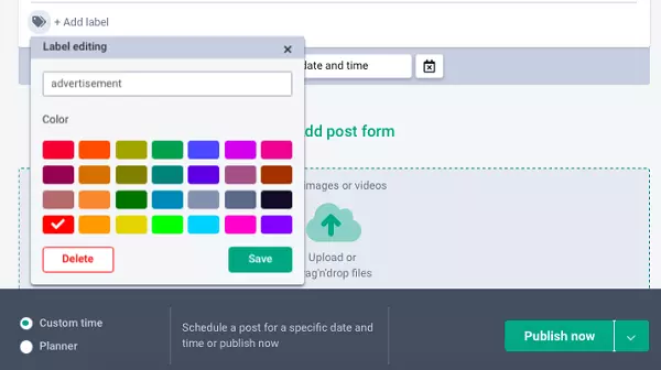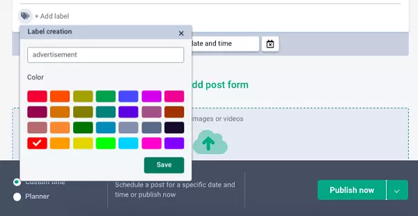Onlypult users can add color labels to any post or story. It is a filter to navigate the content — users create and add labels to the profile. When publishing a post, click the Add label button.