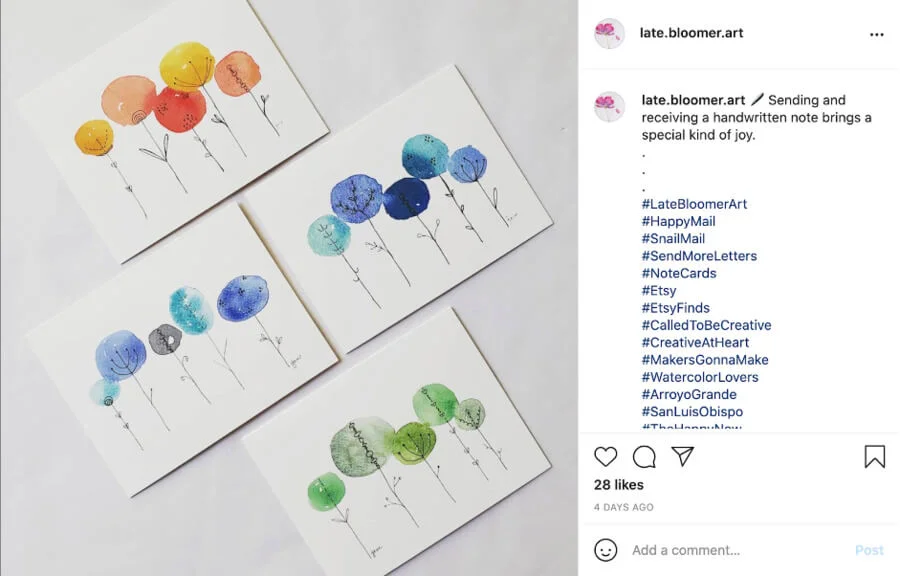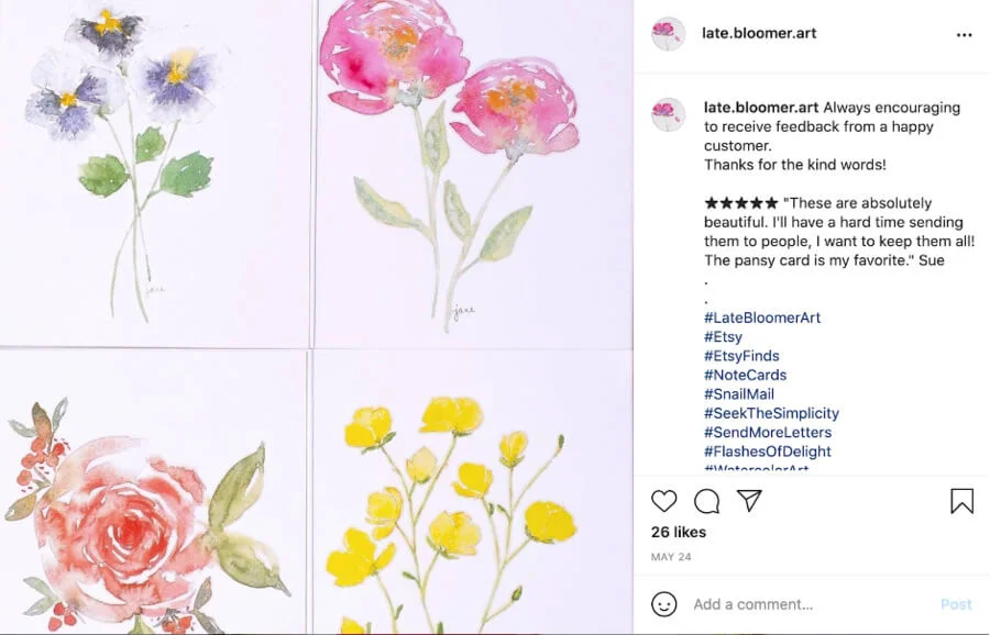 Of course, it’s hard to gauge the success of this shop, but we can still learn a few lessons just by looking at their posts. They use Instagram as their portfolio and display the exact technique they work in. Lots of relevant hashtags also help others discover this account and might even get picked up by Etsy’s official account.
