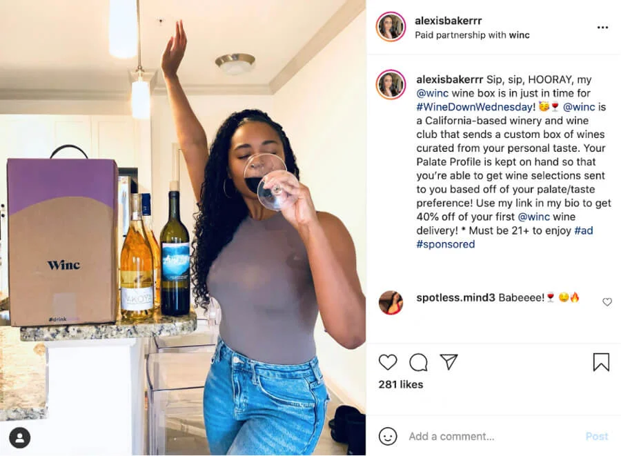 Here is a sponsored post for a company called Winc, which features the sponsored partnership tag we talked about earlier.