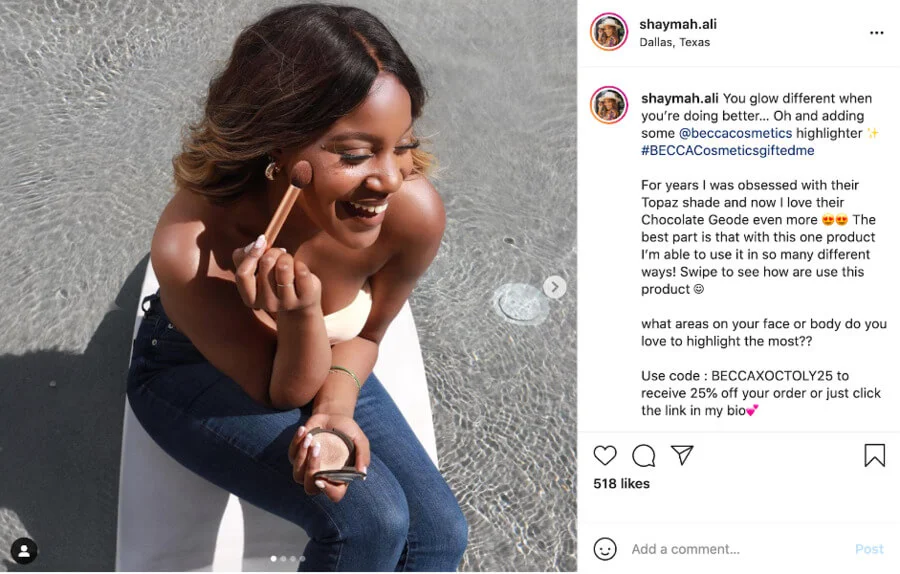 Here, you recommend a product or service to your followers through your post or story and provide your unique code for checkout. It is usually something simple like your name capitalized and the percentage of your discount. The commission for each use is discussed on a case-by-case basis.