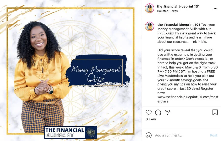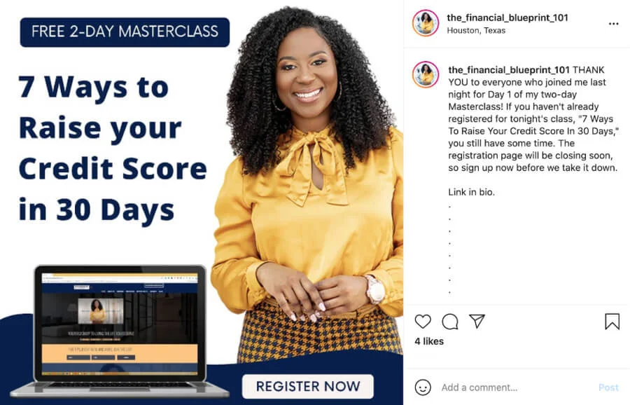 When you open their feed, one of the first things you see is the invitation to a free 2-day Masterclass and an explanation of what to expect. Even though this particular offer is free, it’s just a stepping stone for a paid class that The Financial Blueprint 101 will advertise during the Masterclass.
