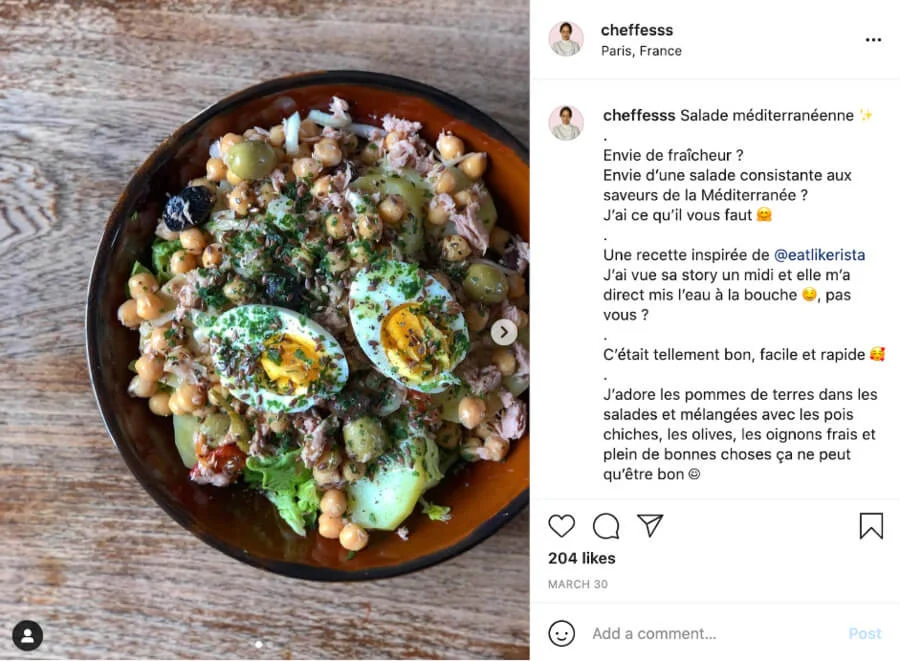 Content creator Cheffesss - Marie first started posting a bunch of free recipes on Instagram and cookbooks on her blog, and brands started taking notice. She recently collaborated with an online food magazine (for a commission, of course) and a cookware brand. For her audience, it was a perfectly organic collaboration.