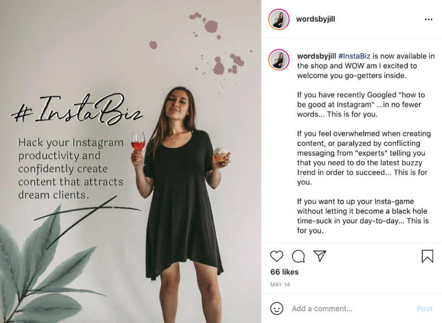 In our last example, we’re using Jill Wise and her entrepreneurship course. The self-described business coach and brand strategist has a full-on program that teaches people how to succeed on Instagram. But it’s not only about being an influencer - the focus is on building revenue streams online that work in current changing environments.