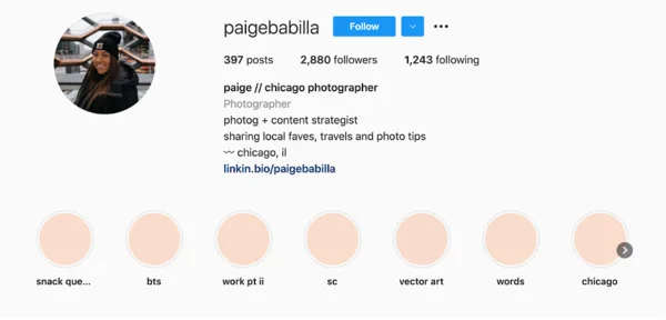 For an account with under 3k followers, we’re going to analyze indirect product/service offers. Paige is a Chicago-based photographer. At first glance, it may seem that this is too broad a niche, but she managed to narrow it down.