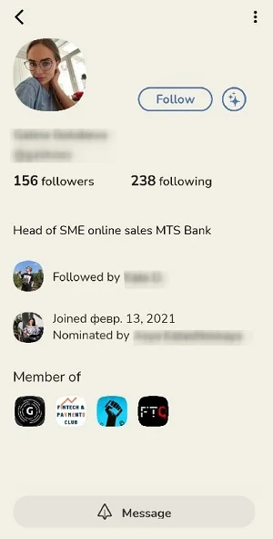 Here you can see the number of subscribers and subscriptions — this is your bio as well. The core text genre in Clubhouse is a filled-in bio. We recommend that you complete it. The profile shows the clubs you are a member of. It is not so easy to become a club member here since it gives particular preferences.