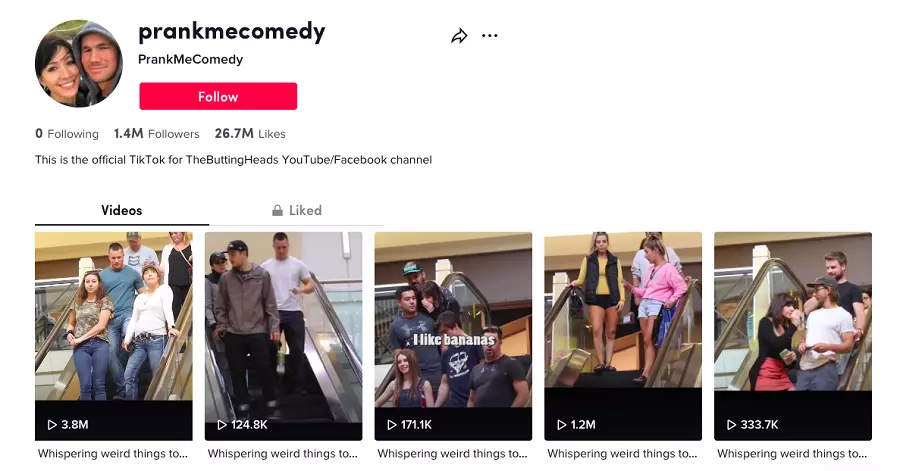 Often accounts are built entirely on shooting and publishing pranks. An example is a Prankmecomedy account, where a series of videos are made for each prank. The numbers are impressive: the videos get 1 million and up to 1.4 million views.